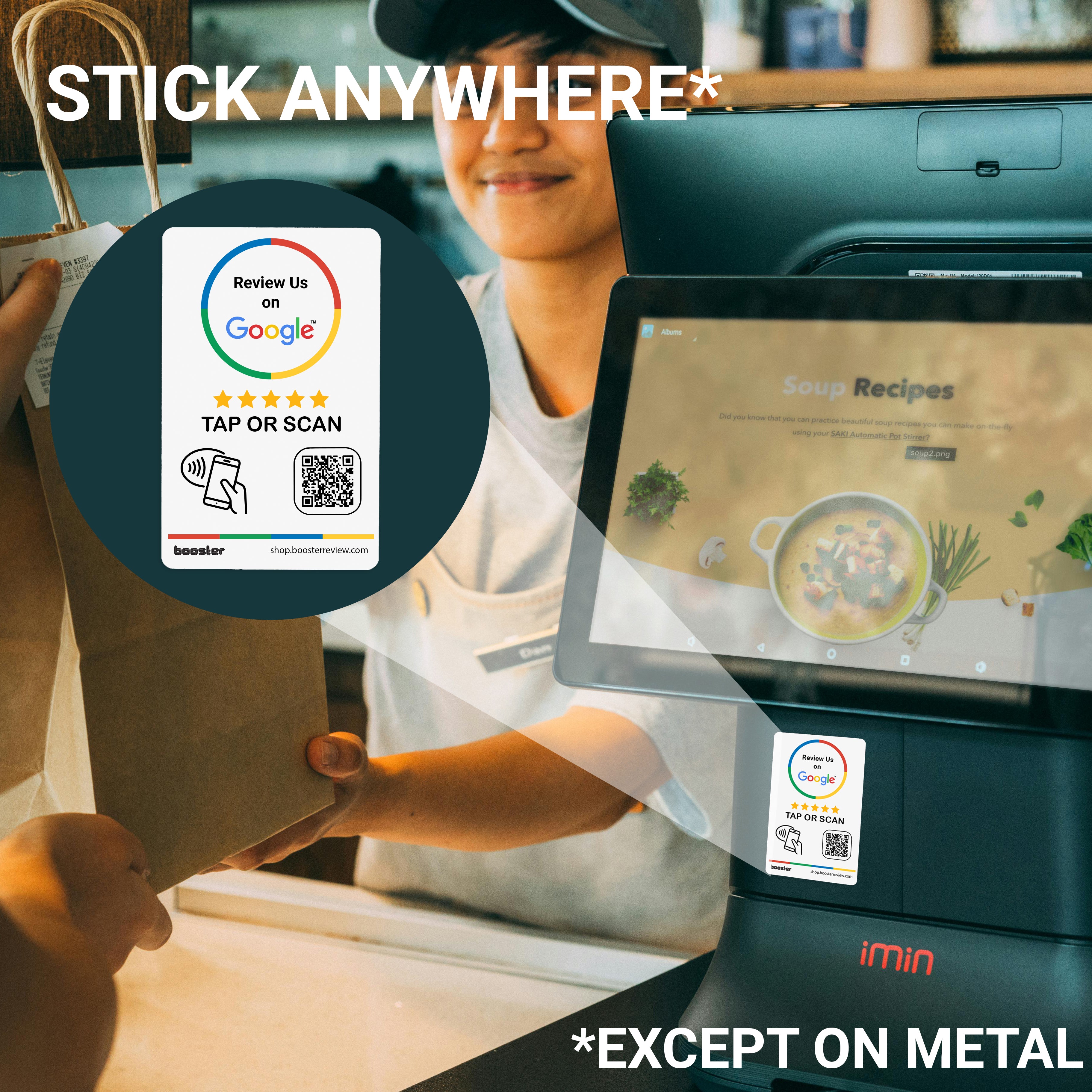 Clienții pot accesa cu ușurință pagina dvs. de recenzii atingând cardul și își pot împărtăși experiența pozitivă. Autocolantele sunt alimentate de tehnologia Booster Review, lider în tehnologia etichetelor de atingere NFC.