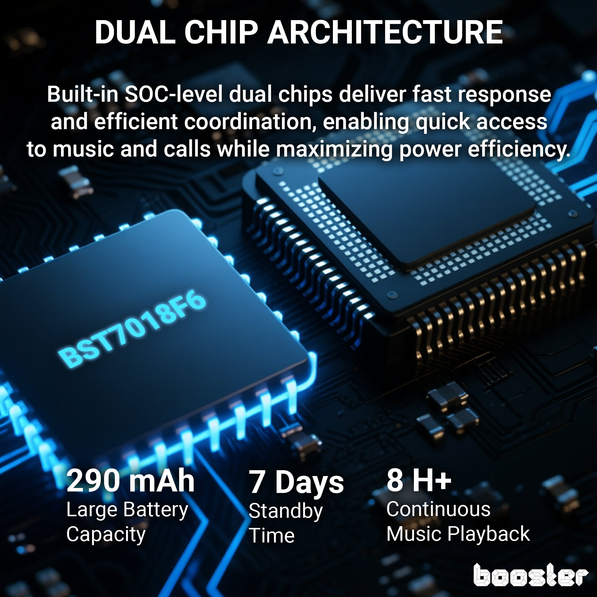 Tehnologia Dual-Chip SOC oferă viteză superioară, conexiuni stabile și consum redus de energie. Bucură-te de muzică, apeluri și control rapid, cu autonomie optimizată pentru întreaga zi.