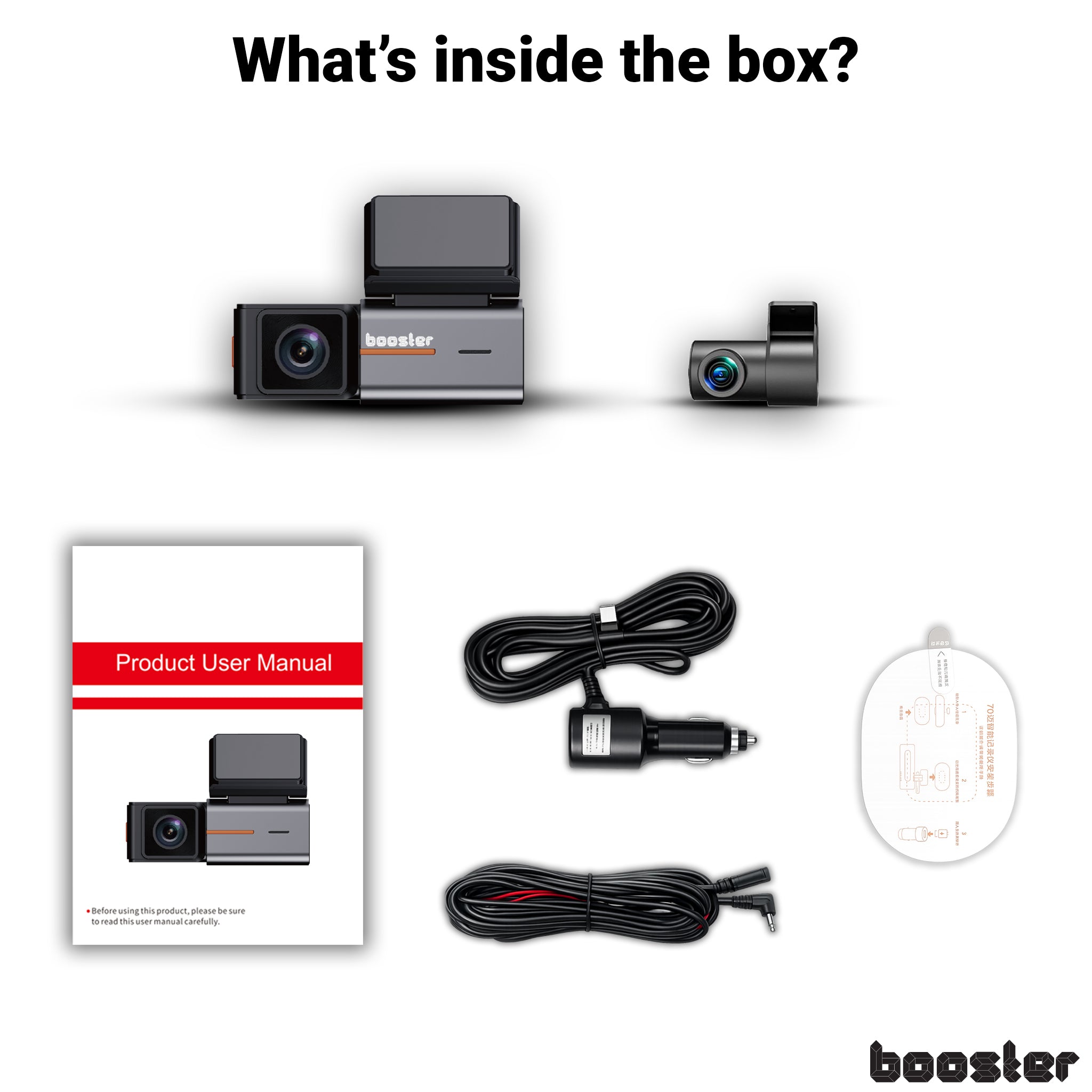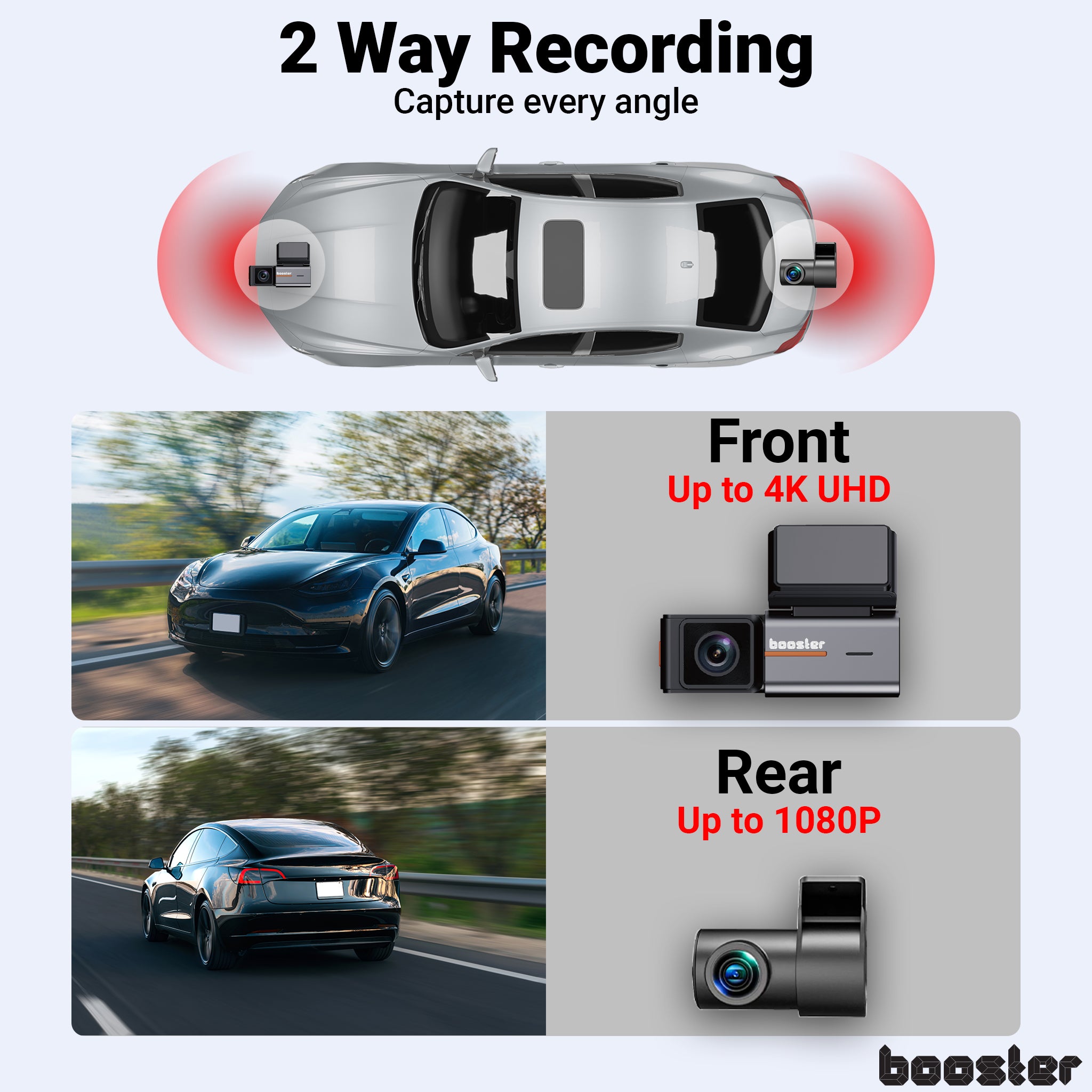 Booster SafeDrive Pro filmează simultan fața și spatele mașinii.