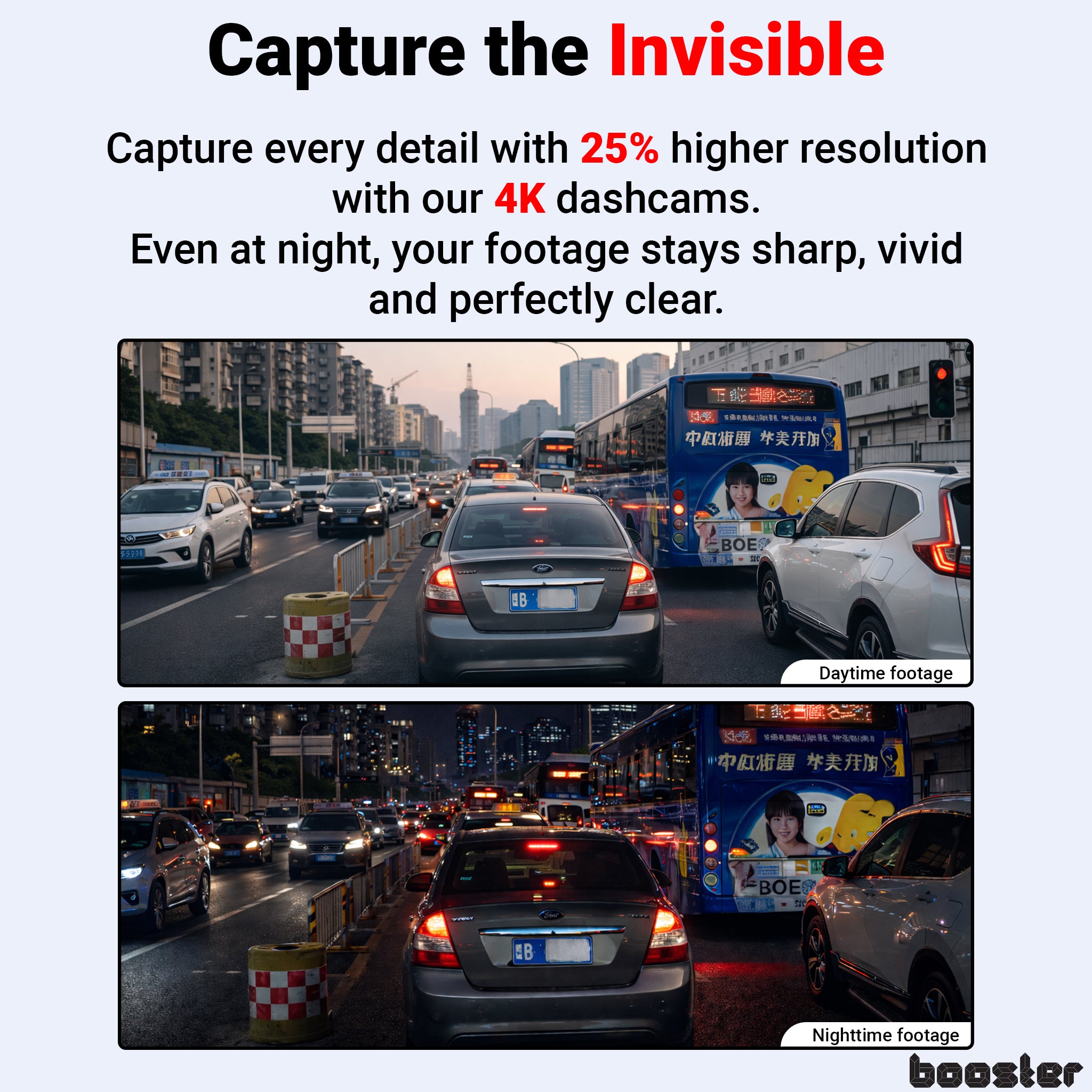 Booster SafeDrive Pro filmează în 4K , surprinzând fiecare detaliu important din trafic – ziua și noaptea.