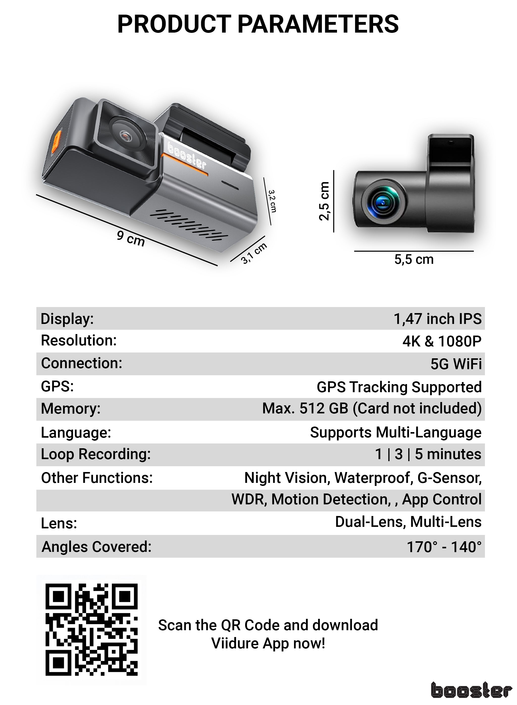 Booster SafeDrive Pro este camera auto ideală pentru șoferii care vor siguranță reală, dovezi clare și tehnologie modernă, fără un dispozitiv voluminos pe parbriz. Cu filmare duală 4K + Full HD, ecran curbat IPS și conectivitate WiFi, fiecare drum este surprins în detaliu.