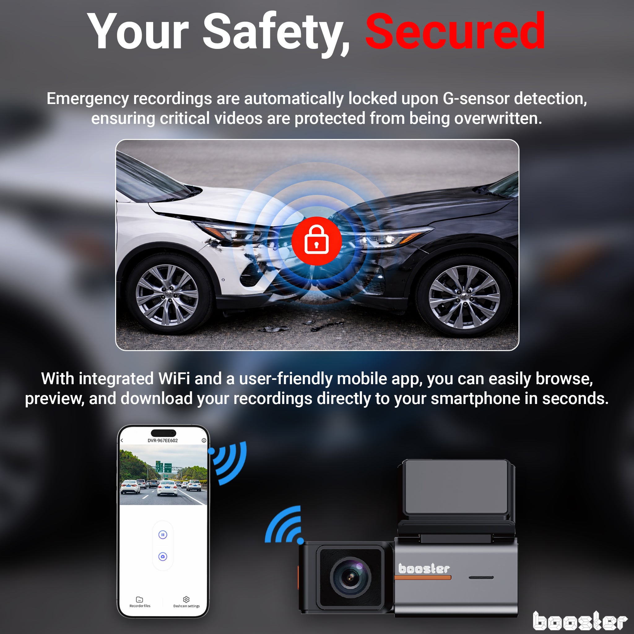 Booster SafeDrive Pro blochează automat înregistrările importante prin G-Sensor, astfel încât momentele critice să nu fie șterse.