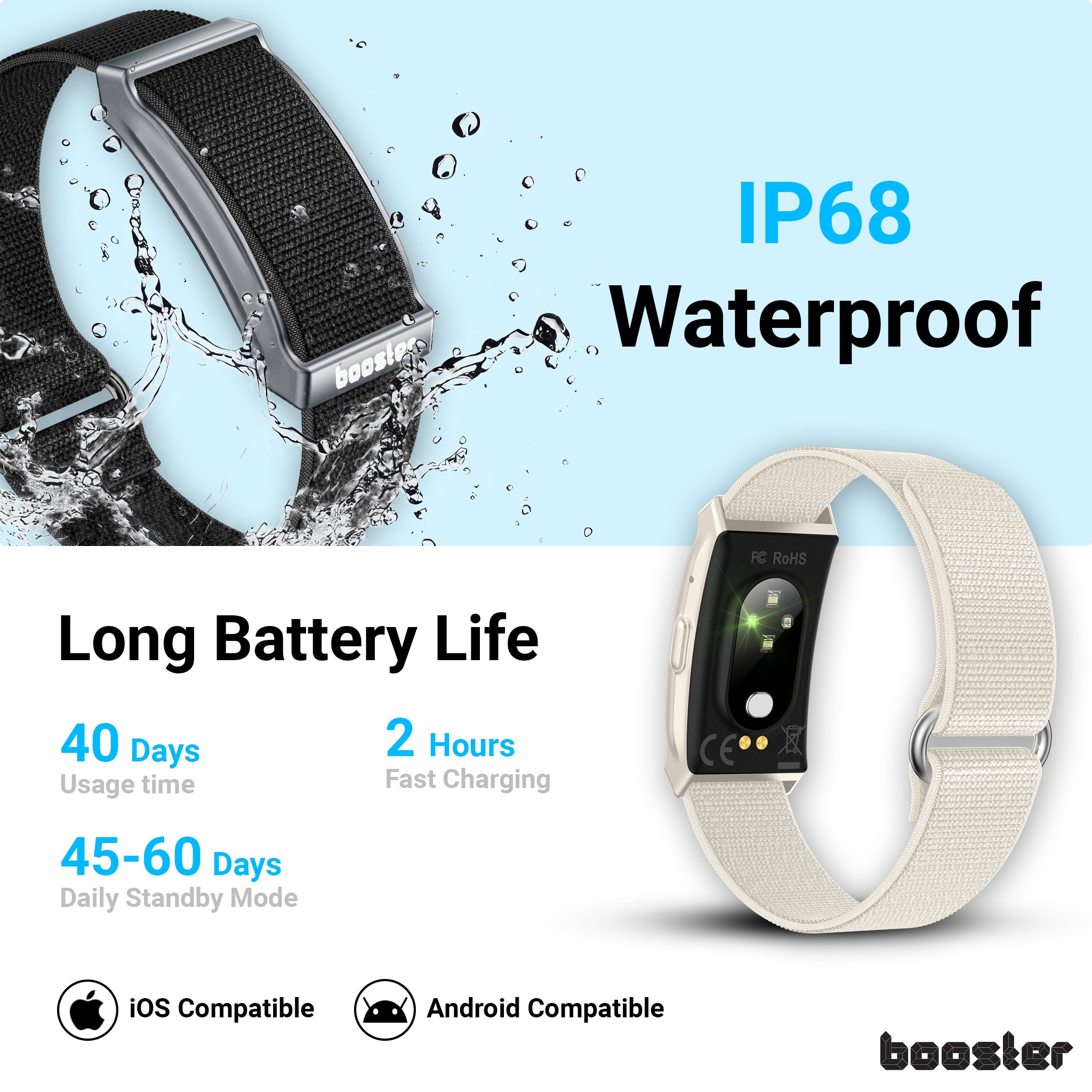 Bucură-te de fiecare strop! Brățara Booster are rezistență la apă îmbunătățită, certificată IP68 – ideală pentru înot, scufundări, surfing și alte activități acvatice zilnice. Performanță și durabilitate în orice mediu.
