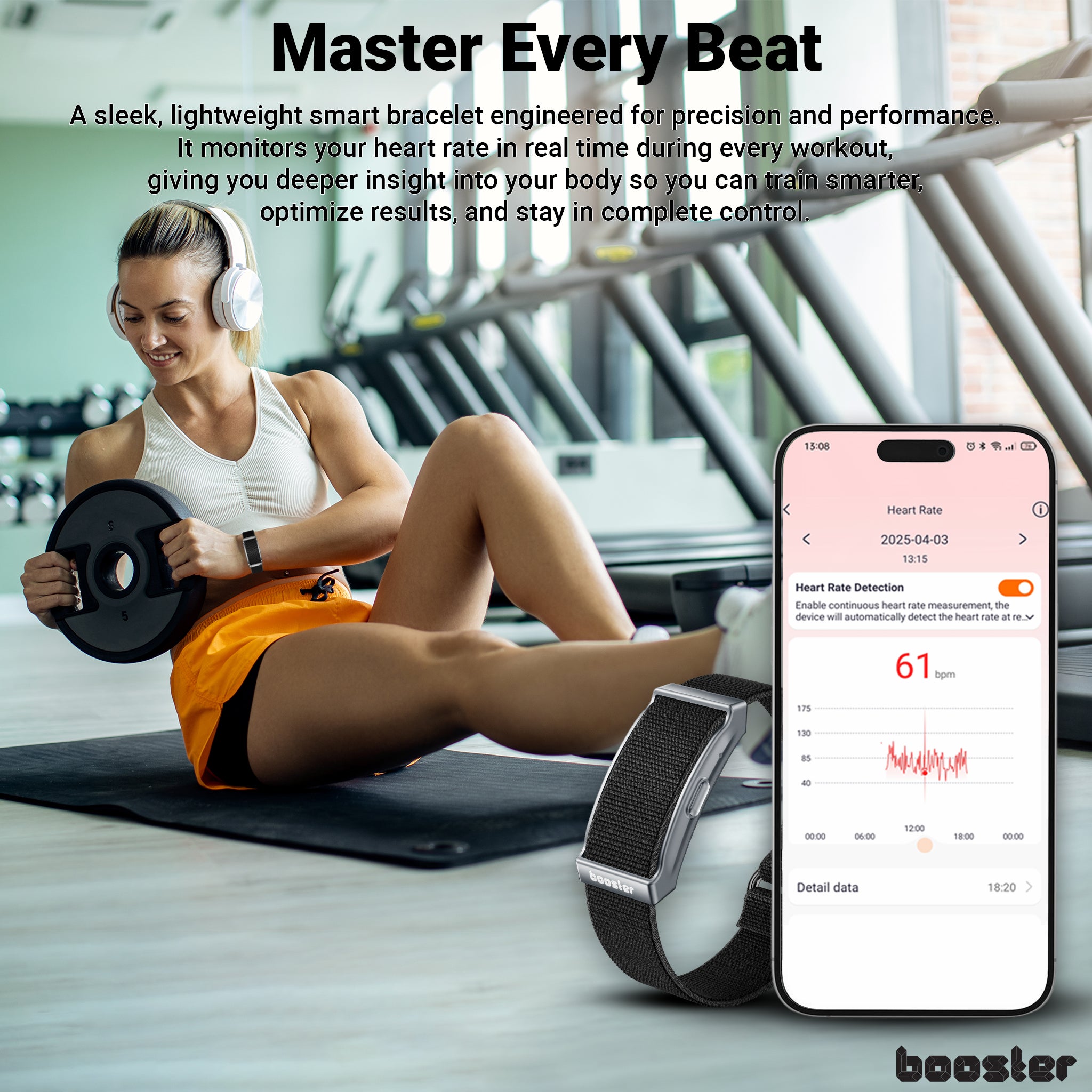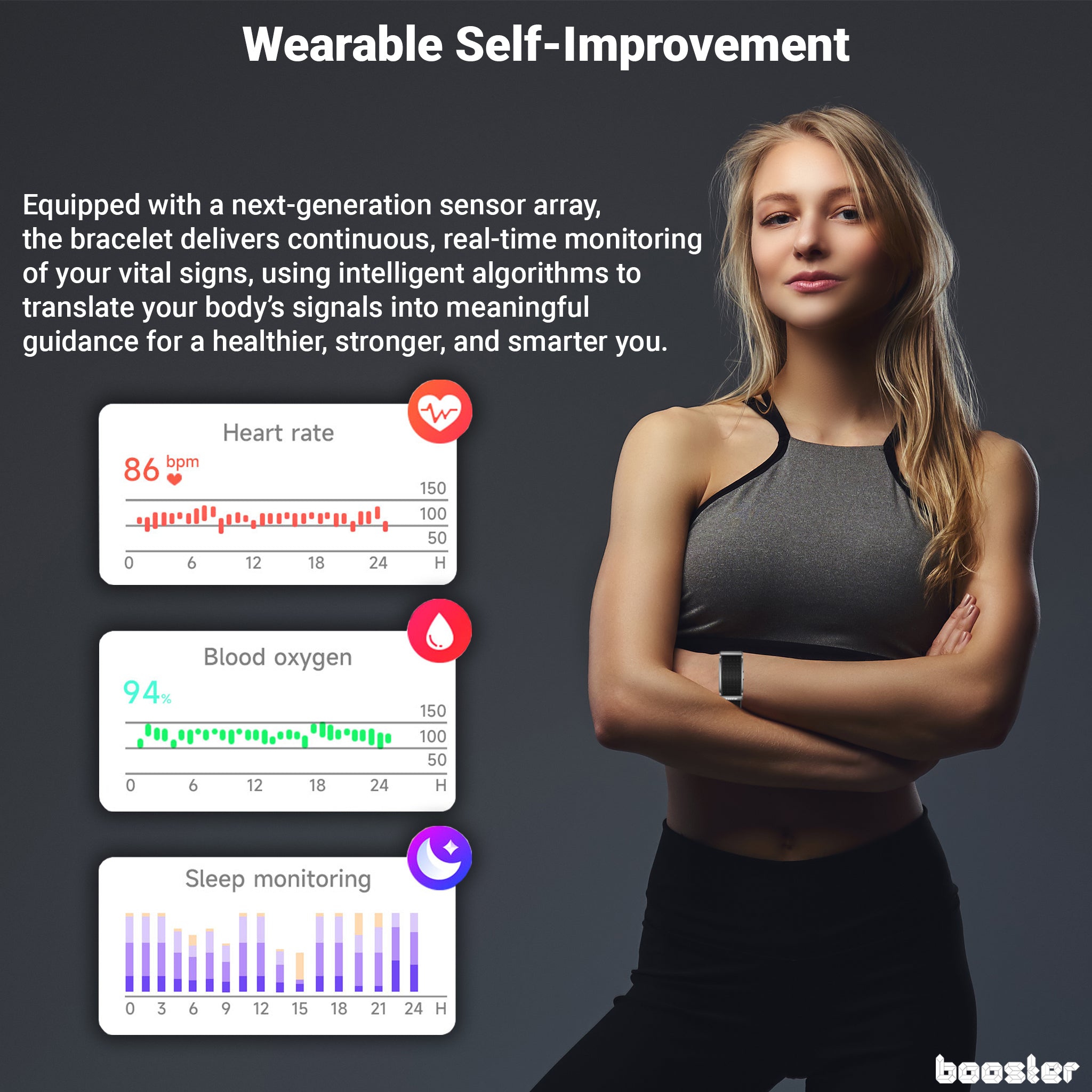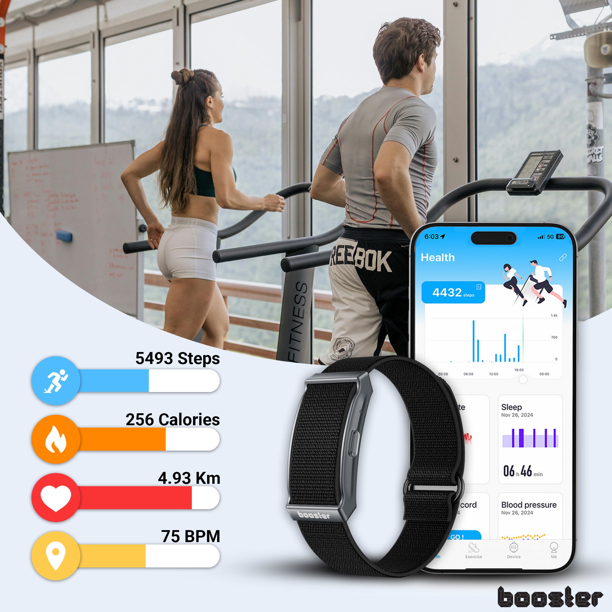 Brățara inteligentă Booster te ajută să îți înțelegi mai bine corpul. Monitorizează indicatorii esențiali ai sănătății zilnic, săptămânal și lunar, direct din aplicația gratuită. Ai control total asupra progresului tău, recuperării și stării generale de bine.