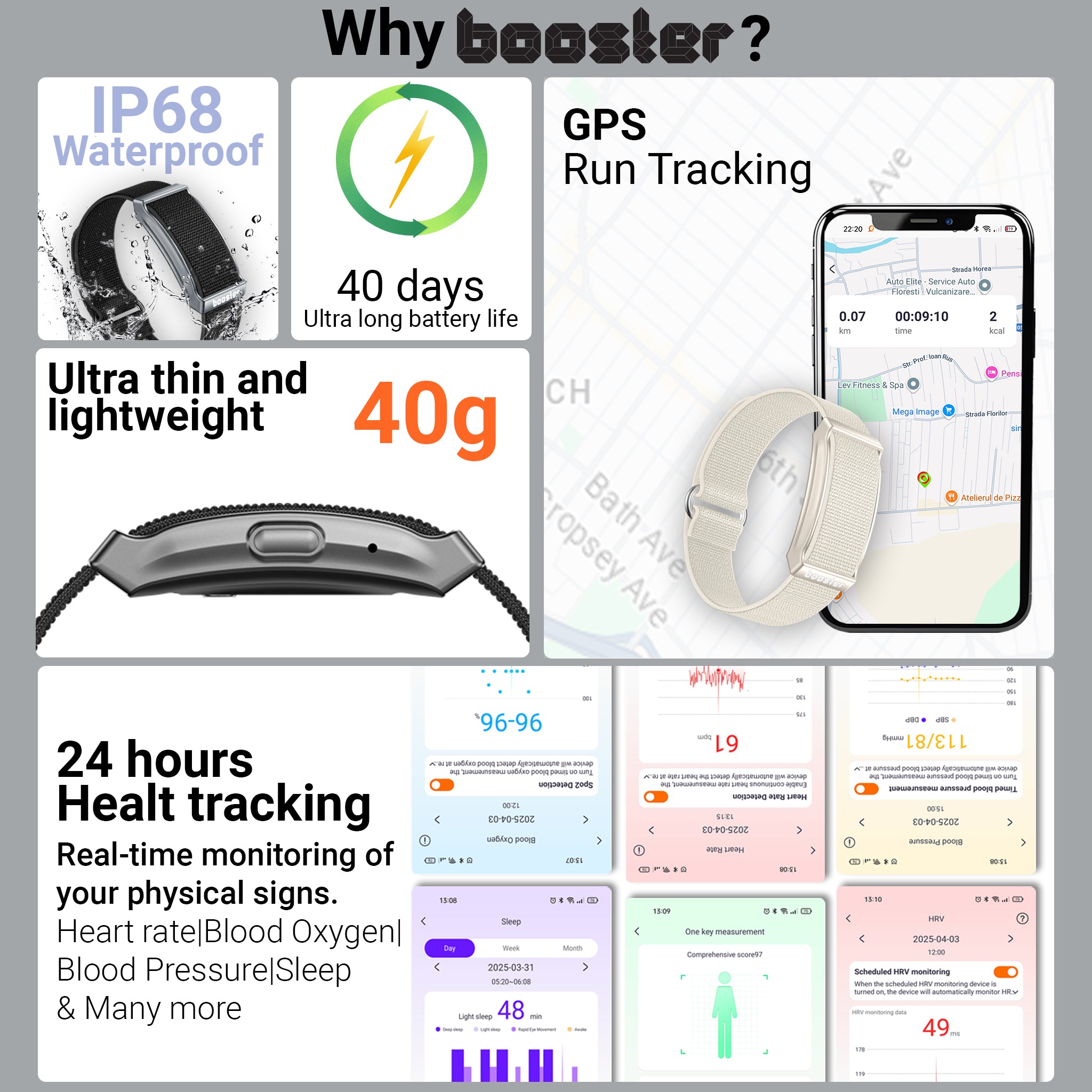 PRECIZIE - SMART SENSING - Booster urmărește peste 30 de date biometrice, inclusiv somnul, activitatea, stresul, sănătatea inimii și măsurători privind sănătatea femeilor. Booster Bracelet Ultra este alimentat de Smart Sensing, care se adaptează la tine - oferind date precise și continue, zi și noapte.